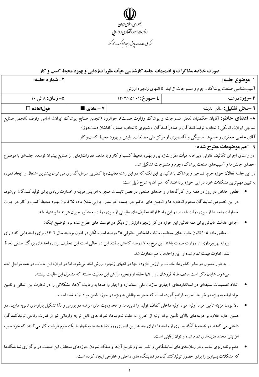 صورت‌خلاصه جلسه آسیب‌شناسی صنعت پوشاک، چرم و منسوجات
