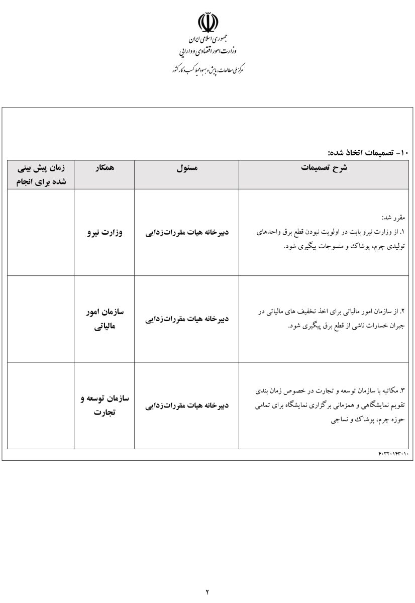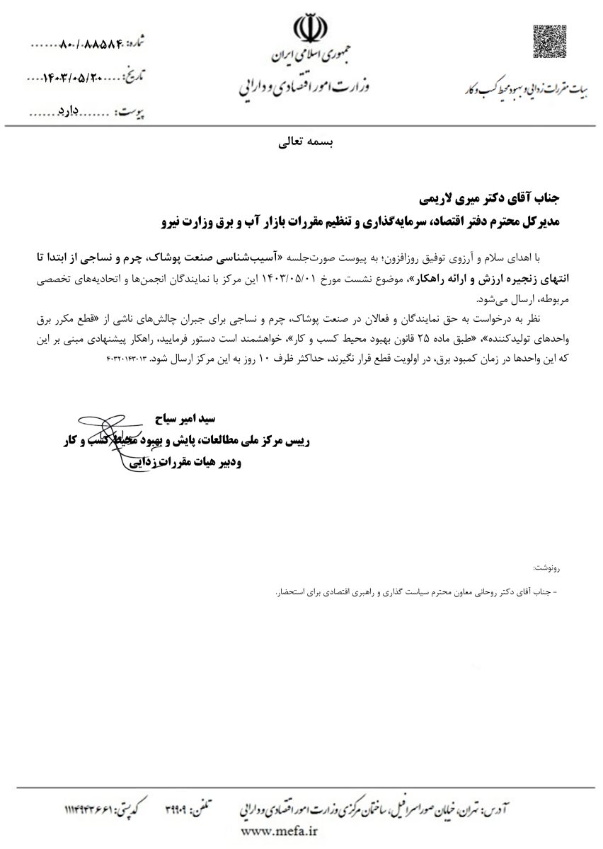 • پیگیری در اولویت نبودن قطع برق واحدهای تولیدی چرم، پوشاک و منسوجات از وزارت نیرو