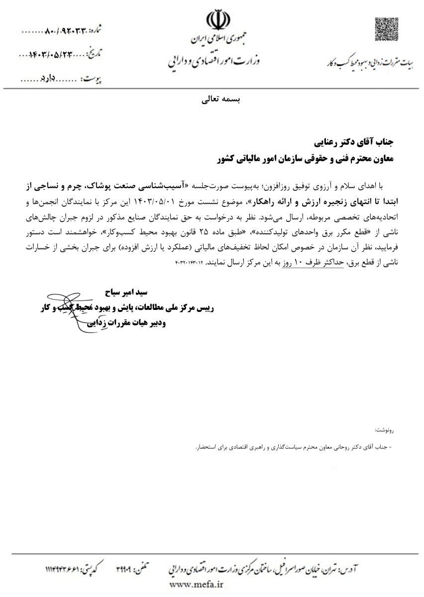 نامه وزارت امور اقتصادی و دارایی به وزارت سازمان امور مالیاتی- 1403/05/23: